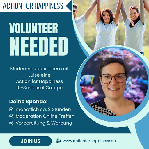 Am 9.6. um 20:00 Uhr treffen wir uns zu einer Vorbesprechung. Den ZOOM-Link schickt dir Luise gerne auf Anfrage (du erreichst sie über die Mattermost-Community oder per Mail an lLuise+afh@matti.name). Voraussetzung ist, dass du als Glücksaktivist*in bei Action for Happiness registriert bist. Optimalerweise hast du auch das Volunteer Training (https://actionforhappiness.org/volunteer, vier Tage à ca. 30 Minuten zu einer von dir gewählten Zeit auf Englisch) absolviert.